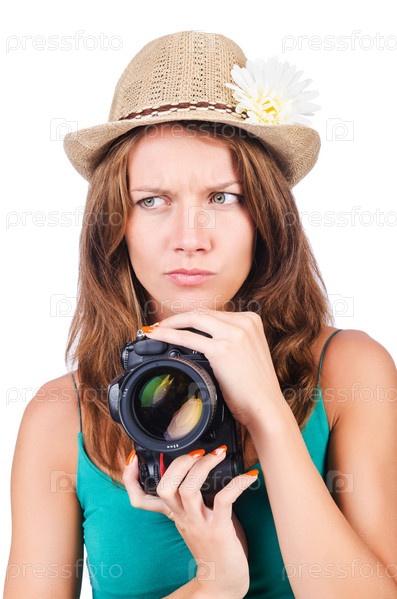 Привлекательные девушка-фотограф на белом фоне