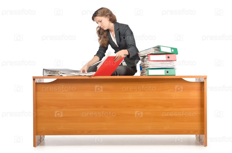Предпринимательница сидит на столе на белом фоне
