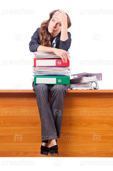 Предпринимательница сидит на столе на белом фоне