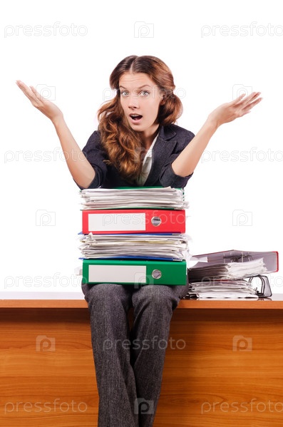 Предпринимательница сидит на столе на белом фоне