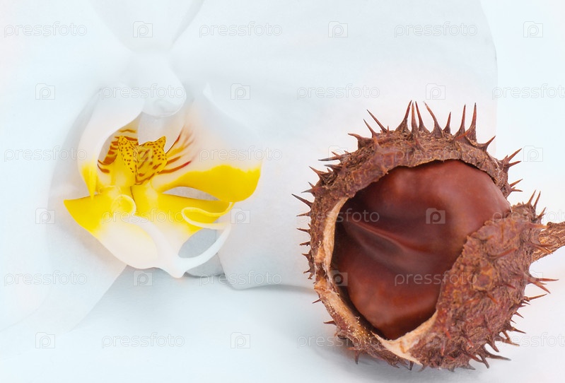 Нежный цветок орхидеи и колючий плод каштана