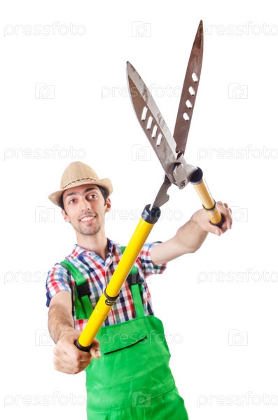 Мужчина-садовник с ножницами на белом фоне