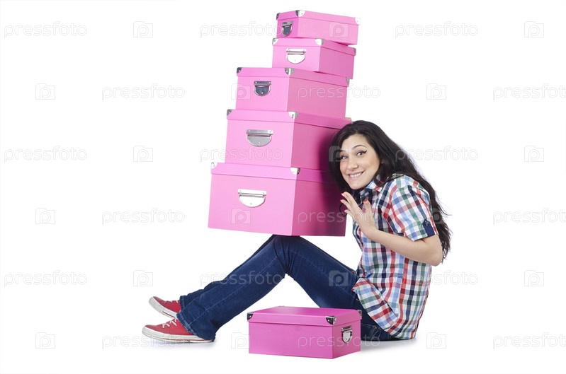 Девушка со стопкой подарочных коробок на белом фоне