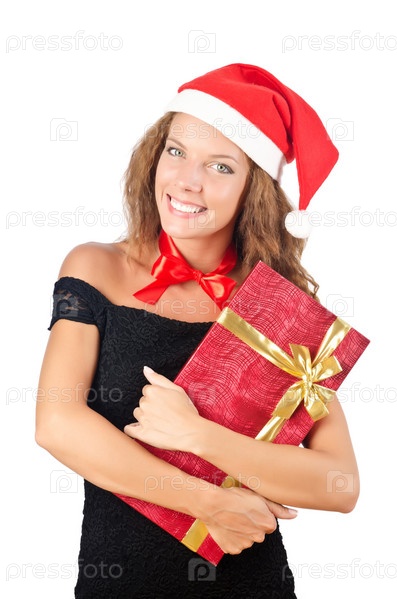 Молодая девушка в костюме Санты с подарком на белом фоне