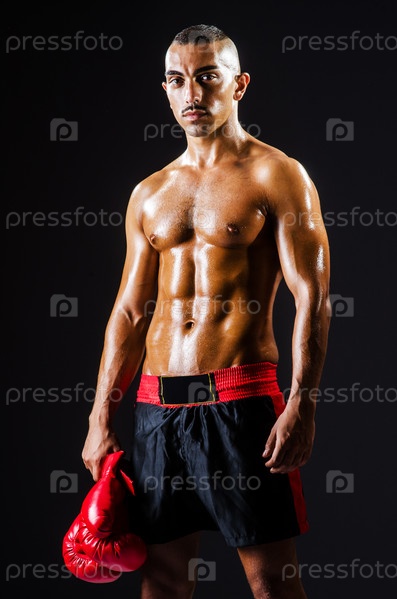 Боксер с красными перчатками в темной комнате