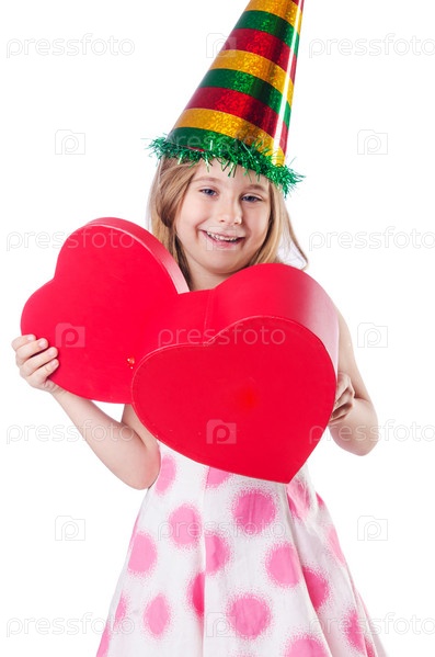 Милая маленькая девочка с подарком на белом фоне