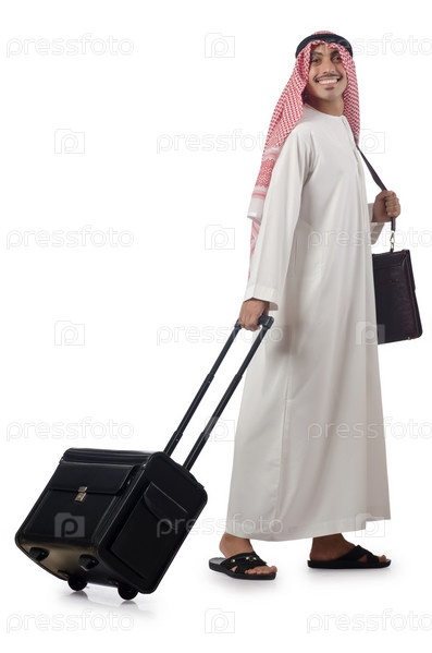 Арабский мужчина с чемоданом на белом фоне