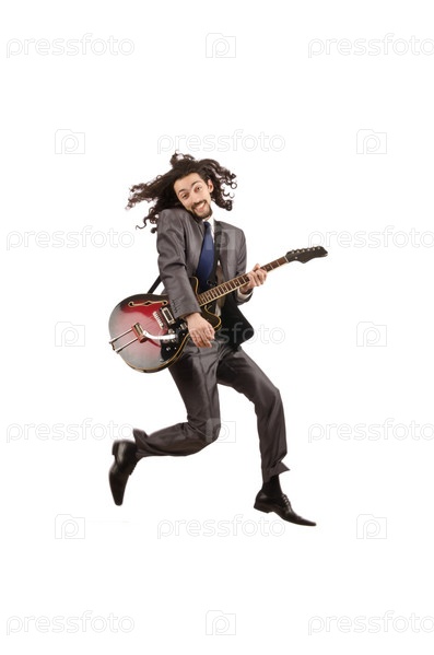 Гитарист в деловом костюме на белом фоне
