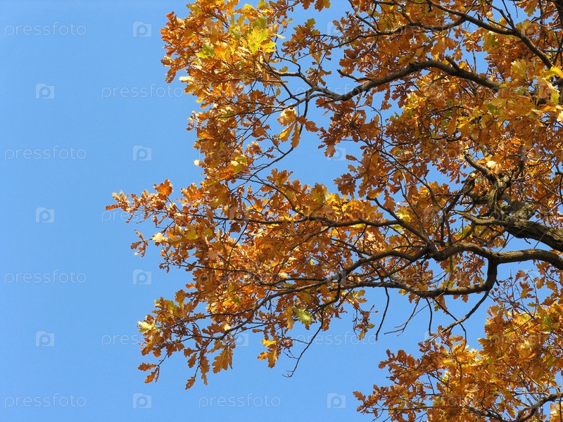 Осенние листья дуба на голубом небе