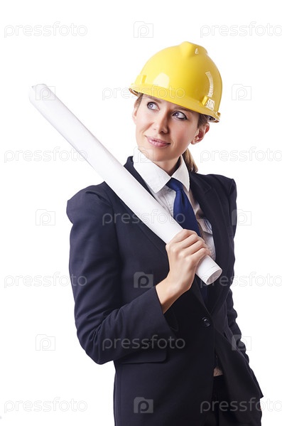 Архитектор с чертежами на белом фоне
