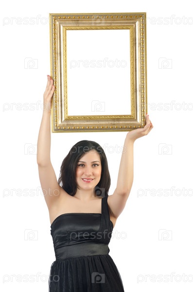 Женщина с фоторамкой на белом фоне