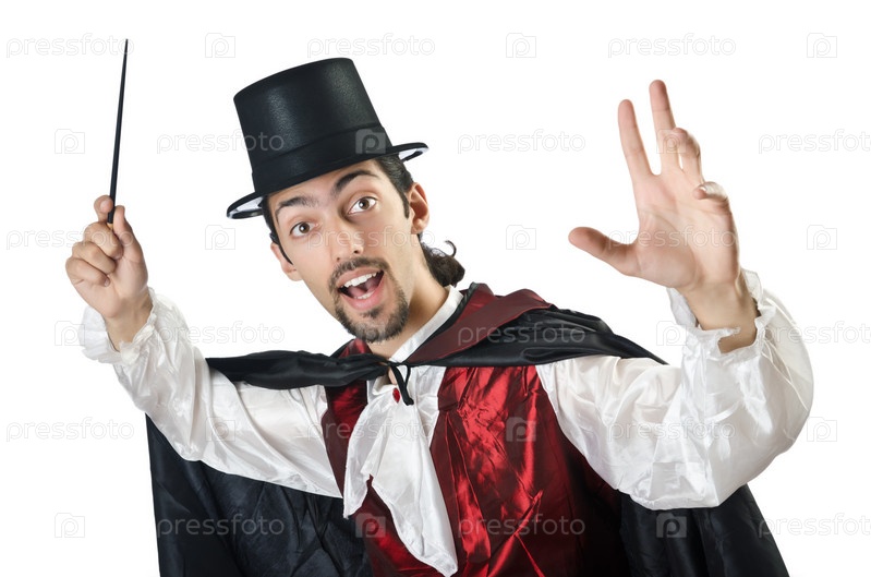 Фокусник, показыкающий трюки, на белом фоне