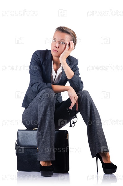 Молодая женщина с портфелем на белом фоне