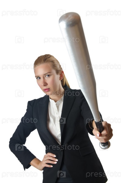 Предприниматель с бейсбольной битой на белом фоне