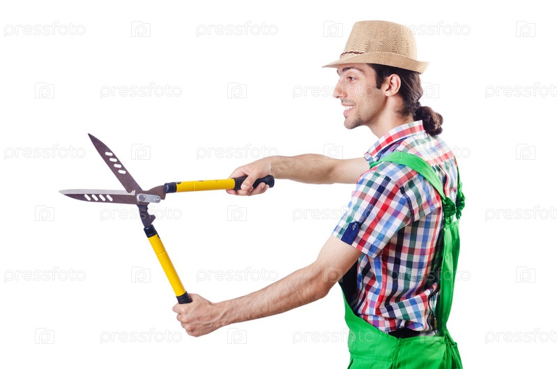 Садовник с ножницами на белом фоне