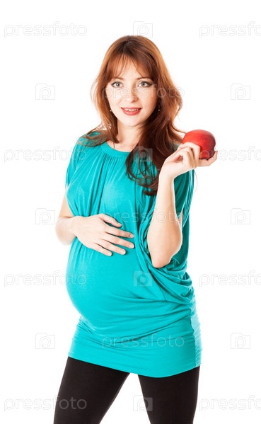 Беременная улыбающаяся женщина держит яблоко в руке