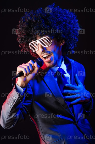 Молодой певец в африканском парике поет на дискотеке