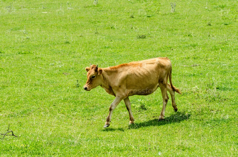 Корова пасется на зеленом поле