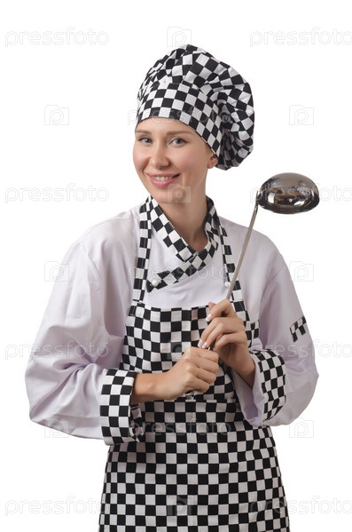 Молодая женщина-повар, изолированная на белом