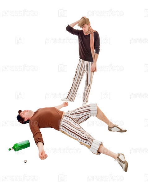 Двое молодых людей с бутылкой, изолированные на белом фоне