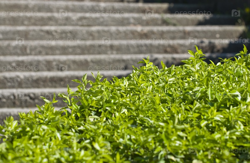 Молодые зеленые листья куста на фоне ступенек лестницы в парке