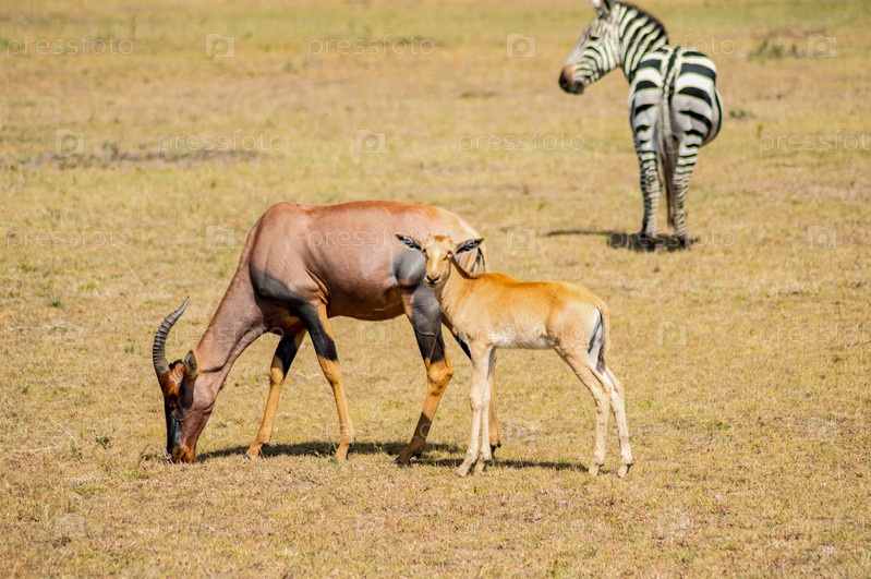 Топи и зебра в саванне Масаи Мара парка в Кении