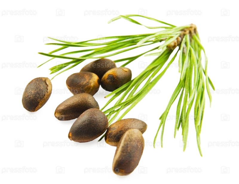 Кедровый орех с хвойными иголками на белом фоне