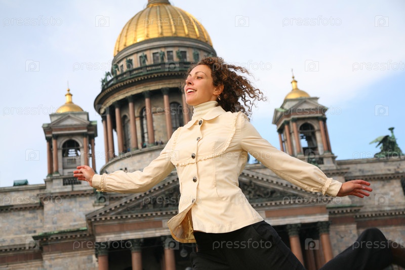 Симпатичная воодушевленная девушка на фоне Исакиевского Собора