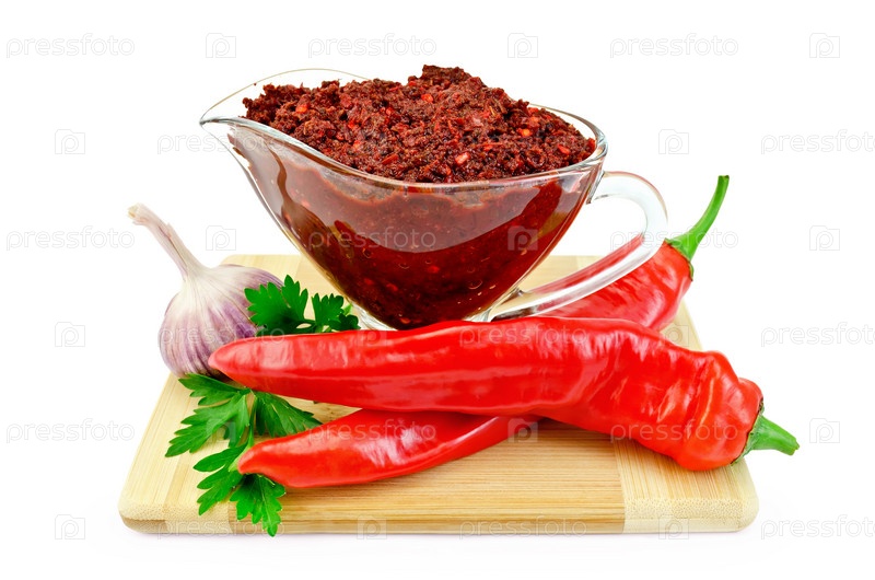 Аджика в стеклянной миске и красный перец