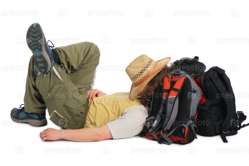 Путешественник спит на рюкзаках, прикрыв лицо соломенной шляпой