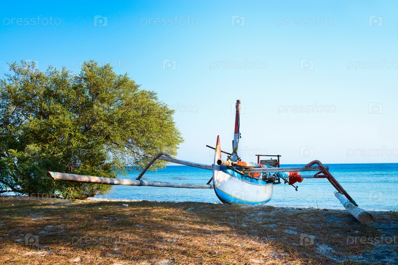 Традиционная индонезийская лодка на пляже с синем морем