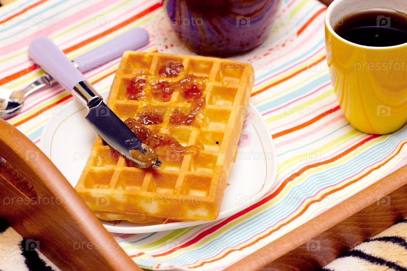 Вафли, джем и чашка чая на столе