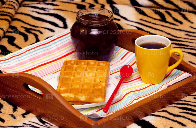Вафли, джем и чашка чая на столе