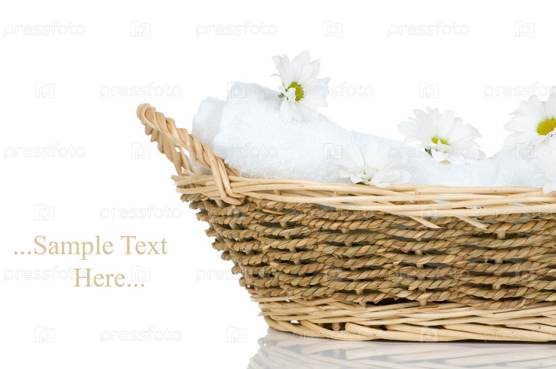 Полотенце и цветы ромашек в корзине на белом фоне