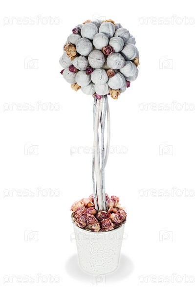 Абстрактная композиция из орехов и сухих роз в вазе, изолированная на белом фоне