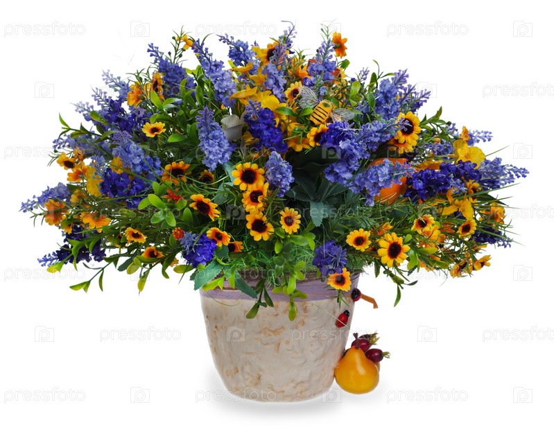 Красочный цветочный букет из лилий, подсолнечника и ирисов в вазе, изолированный на белом фоне