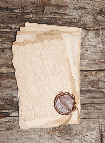 Стопка старой бумаги с сургучной печатью на деревянных досках