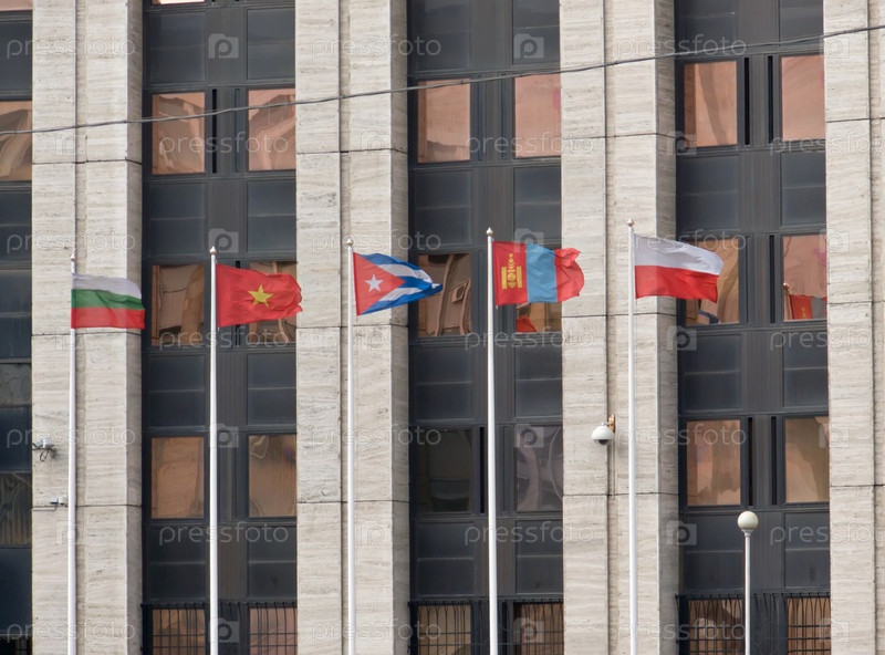 Флаги различных государств на фоне современного здания