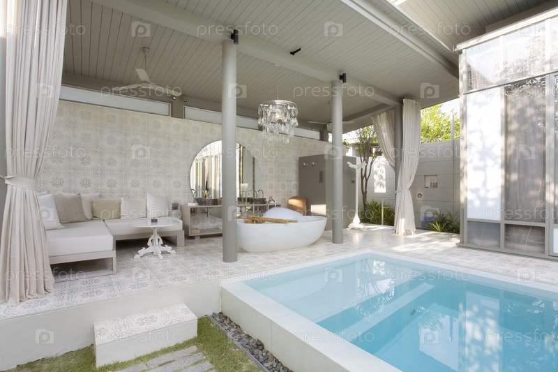 Интерьер красивой современной летней террасы с бассейном