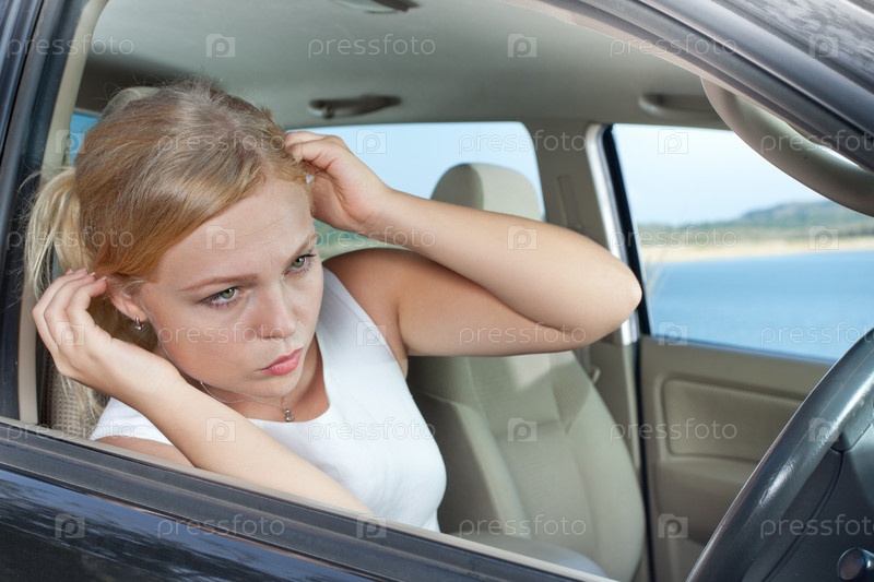 Портрет молодой красивой женщины, сидящей в автомобиле