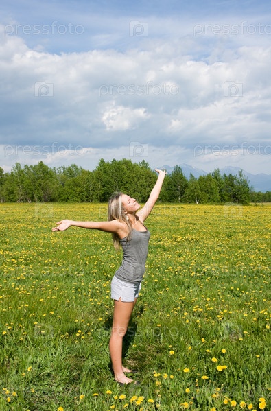 Красивая девушка на поле с одуванчиками