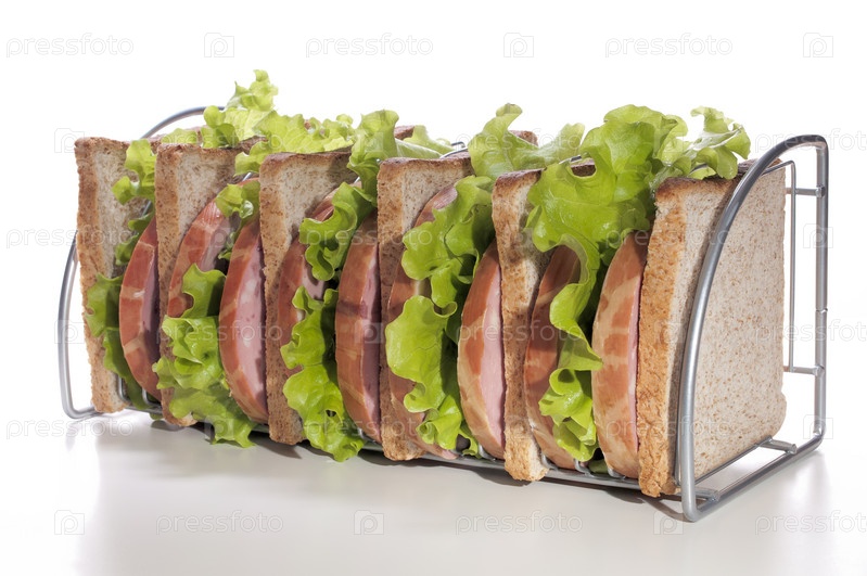 Бутерброды с колбасой и листовым салатом в подставке для компакт дисков. Изолировано