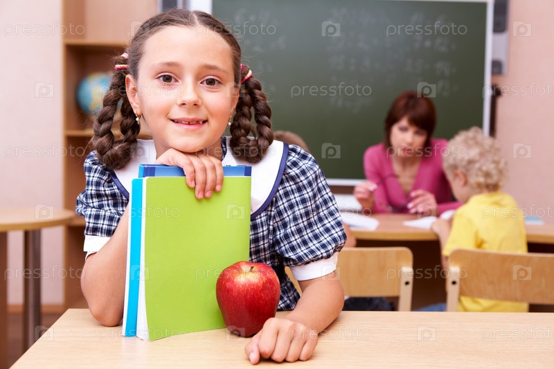 Девочка за партой с тетрадками и яблоком