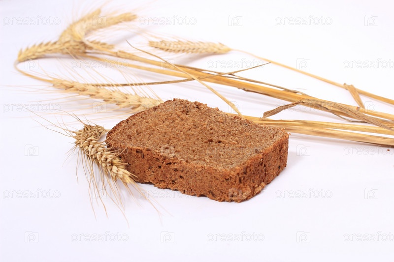 Хлеб и колоски пшеницы на белом фоне