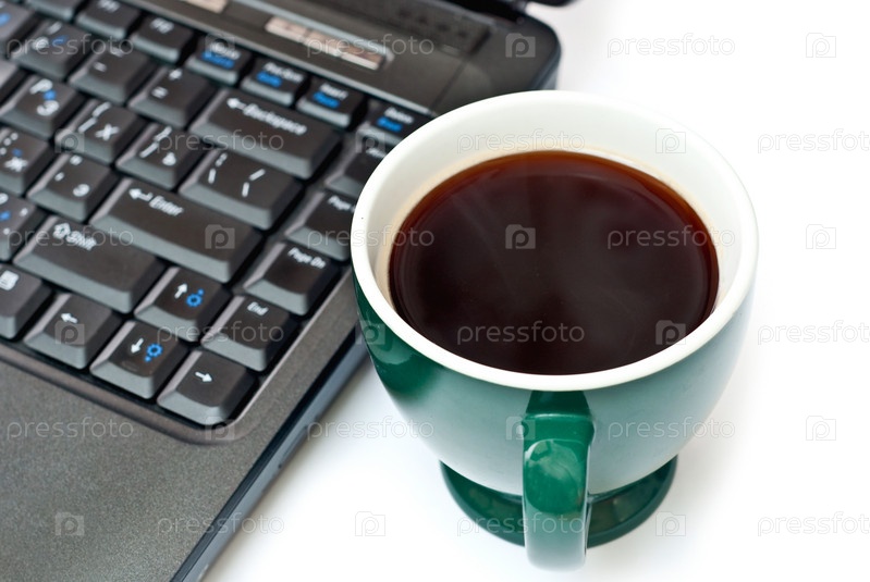 Чашка кофе и ноутбук на белом фоне