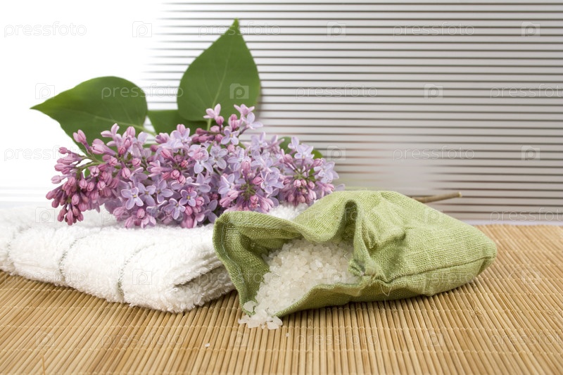 Веточка сирени, соль для ванн и полотенце