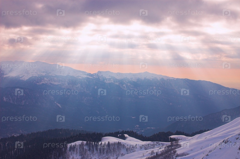 Зимний горный пейзаж с цветовым наклонным лучом света