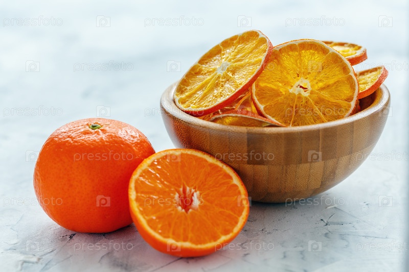 Сухие апельсиновые и лимонные дольки в деревянной миске