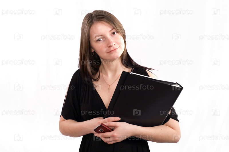 Девушка в черном платье с папкой и телефоном