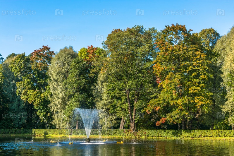Небольшой пруд с фонтаном в парке Петергофа
